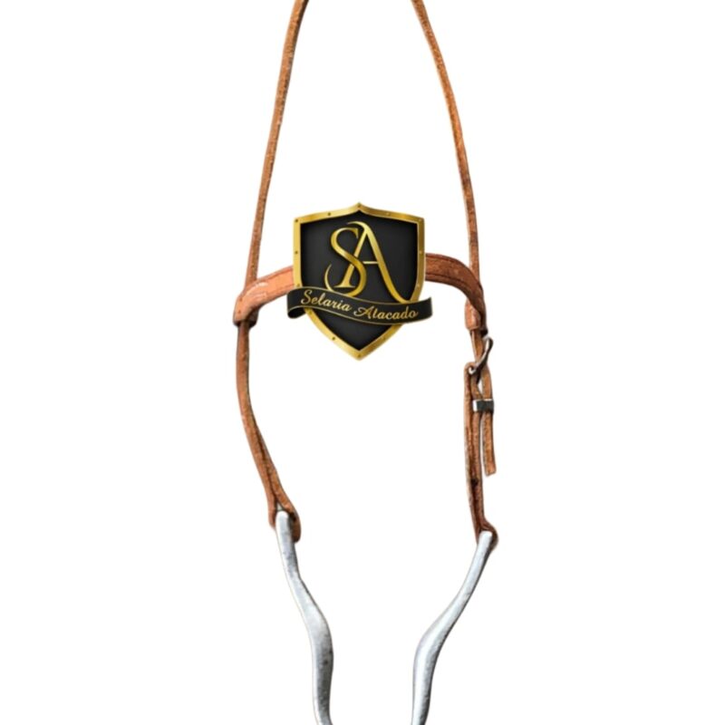 Coleira de ar feita em couro com parte inferior em alumínio, utilizada para impedir que cavalos com vício de aerofagia.