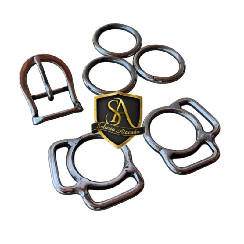 O Kit acompanha 1 fivela com passador, 2 passagem achatadas e 3 argolas todo o material feito em aço inox.