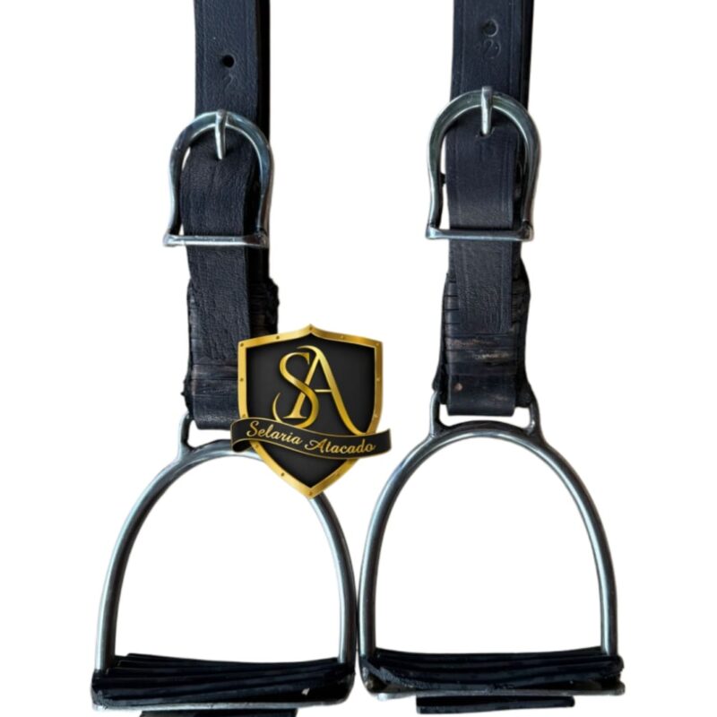 loro feito em sola laminada com fivela em aço inox e estribo com antiderrapante.