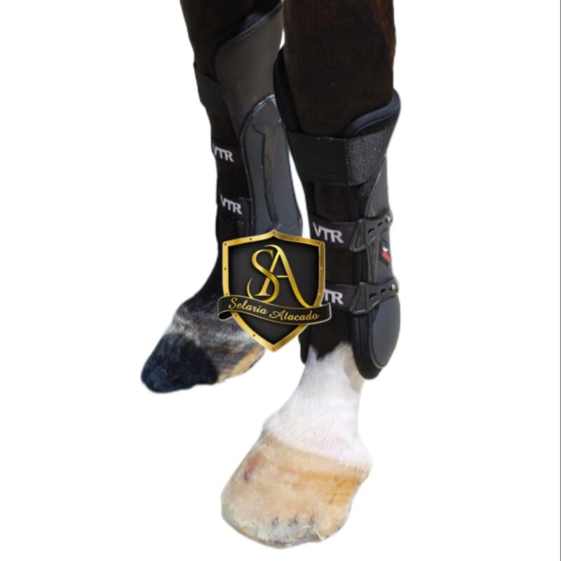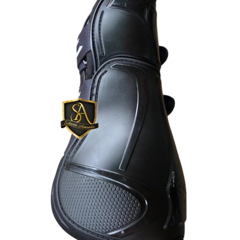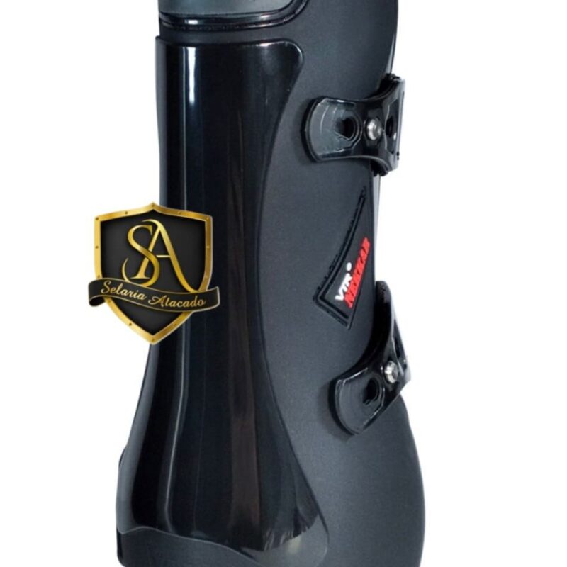 Caneleira fabricada em composto termoplástico de alta qualidade, oferecendo flexibilidade, resistência, excelente absorção de impacto e um formato anatômico que se adapta perfeitamente ao corpo do cavalo.