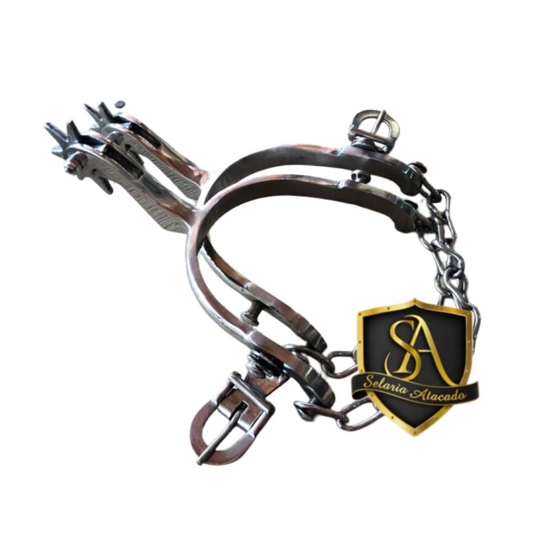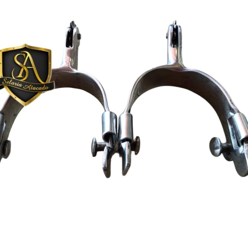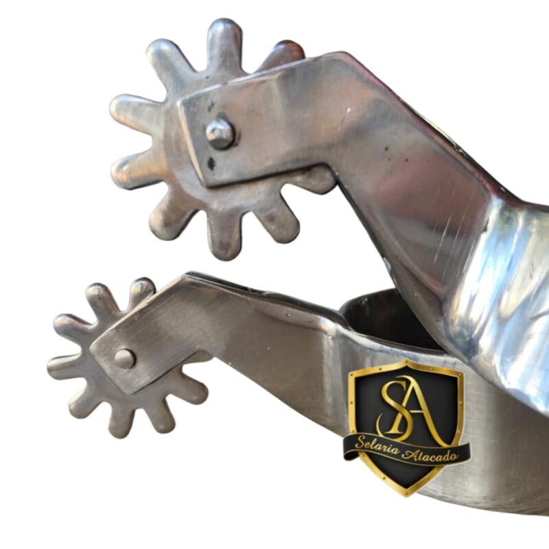 Espora feita a mão no arame em inox, com roseta ninja, com fivela de ferradura.